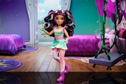 De pop draagt een roze-turquoise jurk met bloembladen, leggings met Plantmagie-motieven, bloemige laarzen en accessoires zoals haarspeldjes, handschoenen en een riem met vlinders. Met de haarstylingaccessoires creëer je talloze kapsels en verhalen. Breid je collectie uit met andere personages en hun eenhoorns voor nog meer avonturen op het Eenhoorneiland.