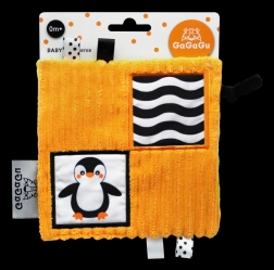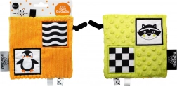 Het dubbelzijdige design biedt twee aantrekkelijke illustraties – pinguïn en wasbeer – en veel details om te ontdekken: lintjes, pluchen lusjes en een groter label voor makkelijker vastpakken. Deze elementen ondersteunen de oog-handcoördinatie en oefenen de fijne motoriek.