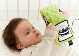 Knispermateriaal en een reeks lintjes, lusjes en labels ontwikkelen het gehoor, de oog-handcoördinatie en de fijne motoriek tijdens het spelen in wieg of kinderwagen.
