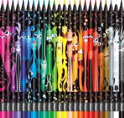 Geniet van tekenen met deze geweldige set van 24 MAPED Color'Peps potloden met monstermotieven, die opvallen door hun unieke zwarte afwerking. Het driehoekige profiel zorgt voor een comfortabele grip, wat helpt bij tekenen voor langere tijd. Ideaal voor kinderen die van speelse en kleurrijke designs houden.