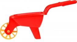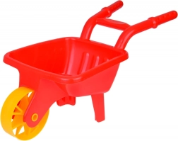 Kunststof kruiwagen met één brede band en comfortabele handgrepen maakt het vervoeren van zand, aarde of speelgoed eenvoudig. Kinderen oefenen hun evenwicht en bewegingscoördinatie.