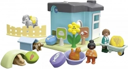 De set ondersteunt de eerste kennismaking met de dierenwereld – waar zij graag rusten, wat ze eten en hoe je voor ze zorgt. Deur die open en dicht kan, het draaibare dak, bordjes en bloemen prikkelen de fantasie en zorgen voor nieuwe speelscenario’s. Kinderen kunnen de kruiwagen duwen, laden en lossen, het voer sorteren en verhaaltjes bedenken over of het hotel open of dicht is en of er nog genoeg voer is.