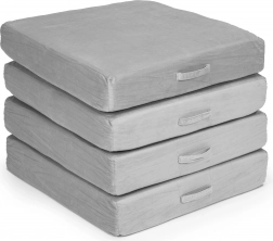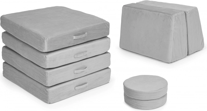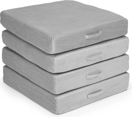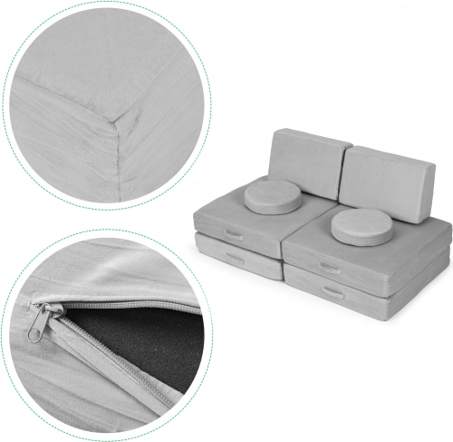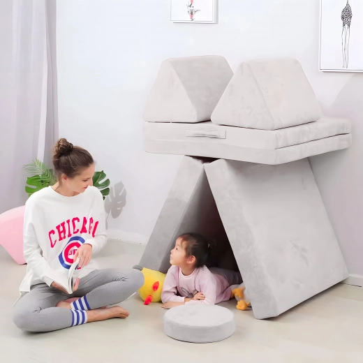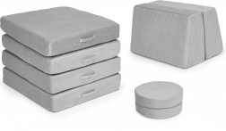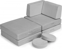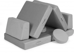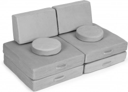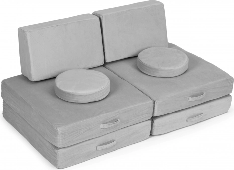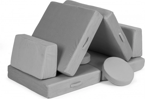 Dankzij de lichte elementen met handgrepen kunnen kinderen het meubel gemakkelijk zelf verplaatsen en opbouwen. Afneembare hoezen met rits maken het onderhoud eenvoudig – trek ze eraf en was ze. De neutrale grijze uitvoering past perfect in moderne interieurs en is bestand tegen dagelijks gebruik.