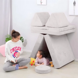 Acht verschillende elementen laten kinderen elke dag nieuwe opstellingen maken – van bank tot speelbunker en zelfs een comfortabele leesplek. Stimuleert creativiteit en DIY-vaardigheden.