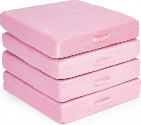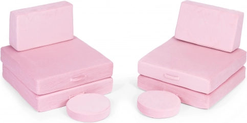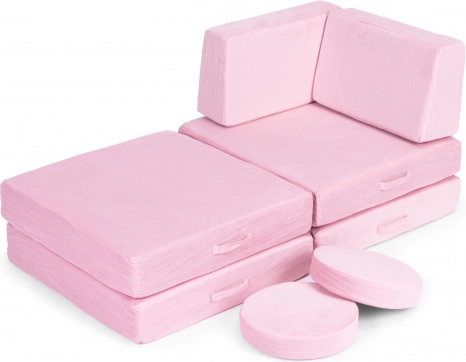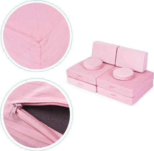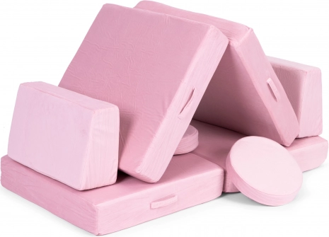 De hoezen met rits kun je gemakkelijk verwijderen en wassen, wat het schoonhouden zelfs bij dagelijks gebruik vereenvoudigt. Dankzij het universele ontwerp in roze past de bank in zowel moderne als speelse interieurs en ondersteunt hij creatief DIY-bouwen – van huisjes tot “voertuigen”.