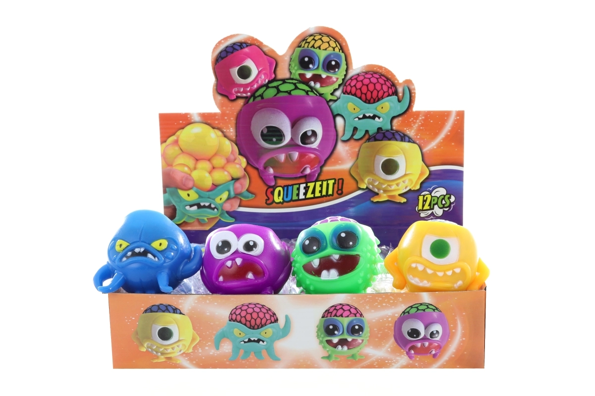 Antistress knijp-monstertje. Bij het knijpen komt er slijm door het gaatje naar buiten. Afmeting ca. 8 cm. Leeftijd 3+