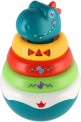 Schattige wiebeldinosaurus met stapelringen maakt kinderen vanaf 6 maanden blij. Bij beweging klinkt een zachte bel en de kleurrijke piramide stimuleert de fijne motoriek, oog-handcoördinatie en het herkennen van kleuren en groottes. Licht en duurzaam kunststof, hoogte 16 cm, in doos.