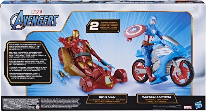 Iron Man en Captain America hebben hun eigen voertuigen – een rode auto voor Iron Man en een blauwe motor voor Captain America.