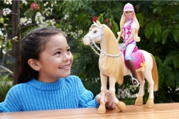 Voor alle jonge paarden- en Barbiefans is deze Malibu-pop een perfecte match. Gekleed in stijlvolle ruiterkleding, inclusief een roze geruit vest, blauwe broek en bruine ruiterlaarzen. Barbie is klaar voor avontuur in galop.