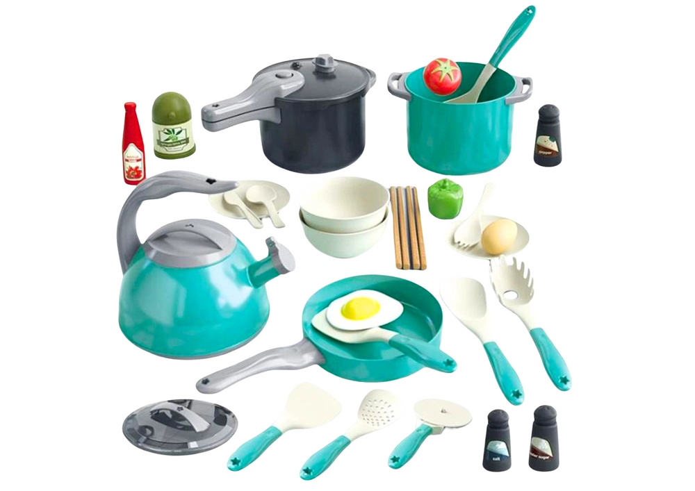 De Kleine Koksset is een ongelooflijk uitgebreide set die uit maar liefst 33 onderdelen bestaat en jonge koks geweldige mogelijkheden biedt om te spelen en te leren. Dankzij diverse accessoires, zoals potten, pan, waterkoker, messen, messenslijper, snijplanken, keukengerei, levensmiddelen en kruidenpotjes, kunnen kinderen in de rol van echte gastheer of gastvrouw kruipen en hun culinaire en sociale vaardigheden ontwikkelen.