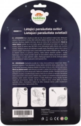 De lichte stoffen parachute ontvouwt zich tijdens de vlucht en stabiliseert de val van het figuurtje – veilig en spectaculair zweven voor kinderen vanaf 3 jaar.