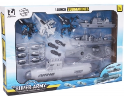 Deze aantrekkelijke set biedt een compleet maritiem avontuur in één verpakking. De hoofonderzeeër van 28 cm is uitgerust met een werkende torpedolanceerder en een terugtrekmotor voor dynamisch spel. De vloot wordt aangevuld met een vliegdekschip, een slagschip, een kruiser en drie straaljagers met vrijlopende wielen.