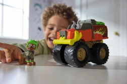 Boomer is gekleed in zijn stijlvolle outfit uit de Grote Wielen-serie, inclusief helm en rugzak. Het plaatsen van de figuur achter het stuur voegt een extra niveau van realisme en actie toe aan het spel.
