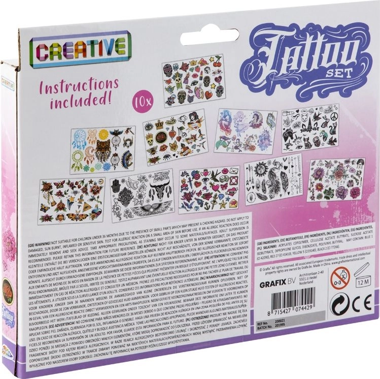Ontdek de creatieve wereld met de Grafix set tijdelijke tatoeages, die een kleurrijke reeks motieven biedt voor kleine fashionista’s. Dankzij de eenvoudige toepassing kunnen kinderen met hulp van een volwassene de tatoeages in een mum van tijd aanbrengen. Tijdelijke tatoeages zijn ideaal voor weekendplezier, verjaardagsfeestjes of als klein cadeautje.