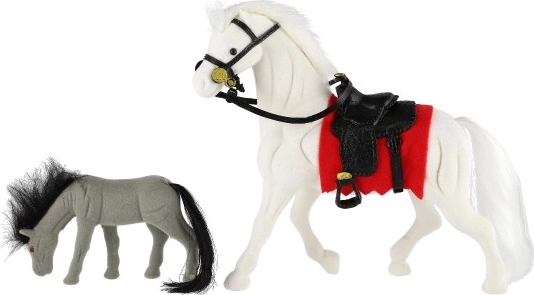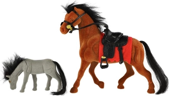 Paard met zadel en veulen voor alle kleine paardenliefhebbers. Gemaakt van kunststof met een fluweelachtige afwerking, ideaal voor een speelse boerderij.
