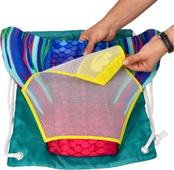Meshpanelen en luchtig materiaal helpen de inhoud sneller te drogen na het zwemmen, zodat de zak klaar is voor het volgende gebruik.