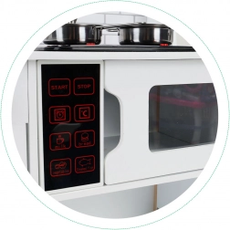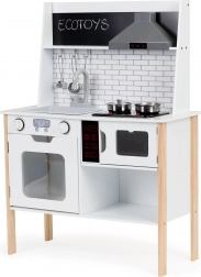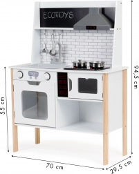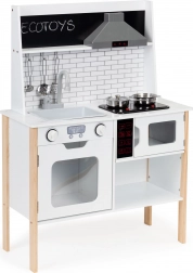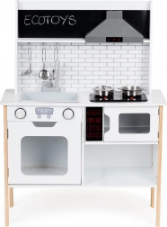 Stijlvolle houten keuken voor kleine koks vanaf 3 jaar, met realistisch speelplezier dankzij LED-verlichte kookplaten, kookgeluiden en draagknoppen met “klik”. Met een openende oven en magnetron, bewegende kraan en opbergkastjes voor orde en netheid. De hoogwaardige, stabiele constructie van ECOTOYS stimuleert fantasie en fijne motoriek.