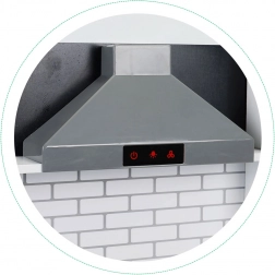 Het bovenste deel van de keuken is uitgerust met een afzuigkap en praktische haakjes, zodat accessoires altijd binnen handbereik zijn en de keuken overzichtelijk blijft.