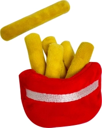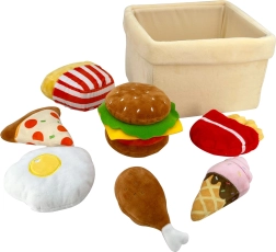 Deze schattige pluche set met snelle snacks brengt een flinke portie plezier in de kinderkeuken. In de praktische mand vind je een hamburger, frietjes, pizza, kippenpoot, spiegelei, muffin en ijsje. Elk onderdeel is zacht, ligt prettig in de hand en oogt dankzij de geborduurde details aantrekkelijk en realistisch.