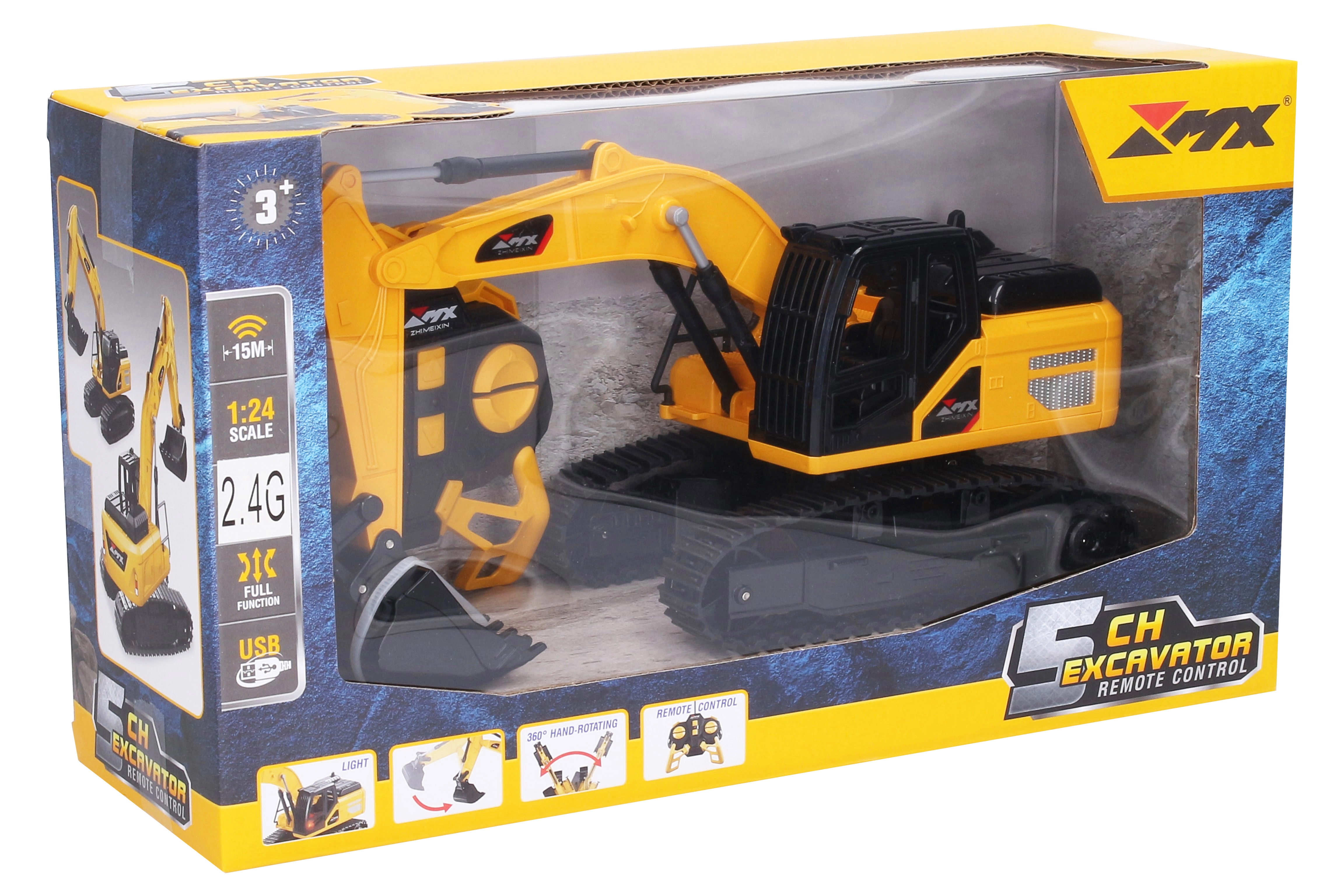 Het model is klaar voor gebruik – in de verpakking vind je een oplaadbare batterijpack van 3,7 V 500 mAh en een USB-oplaadkabel. De controller vereist 2× AA-batterijen (niet inbegrepen). De ON/OFF-schakelaar bevindt zich aan de onderzijde van de graafmachine voor eenvoudig in- en uitschakelen. Het handmatig draaien van de basis ondersteunt realistisch spel en de ontwikkeling van de fijne motoriek.