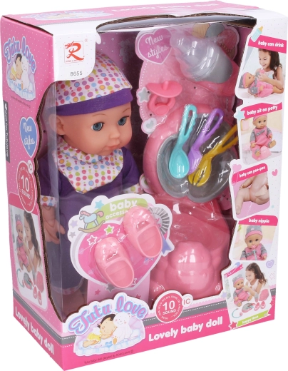 Alles voor een complete ervaring is inbegrepen: potje, bordje, bestek, flesje en speen. De pop heeft een ideale lengte van 30 cm, ligt fijn in de hand en is geschikt voor dagelijks spelen thuis en onderweg.
