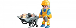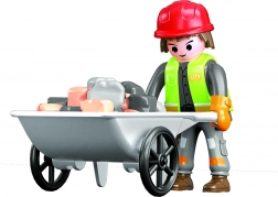 Bevat een figuurtje van een bouwvakker, kruiwagen, lading en gereedschap