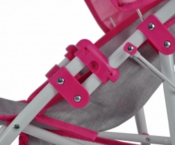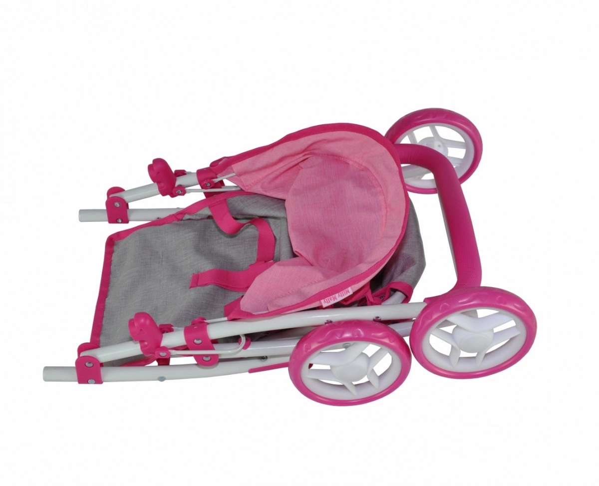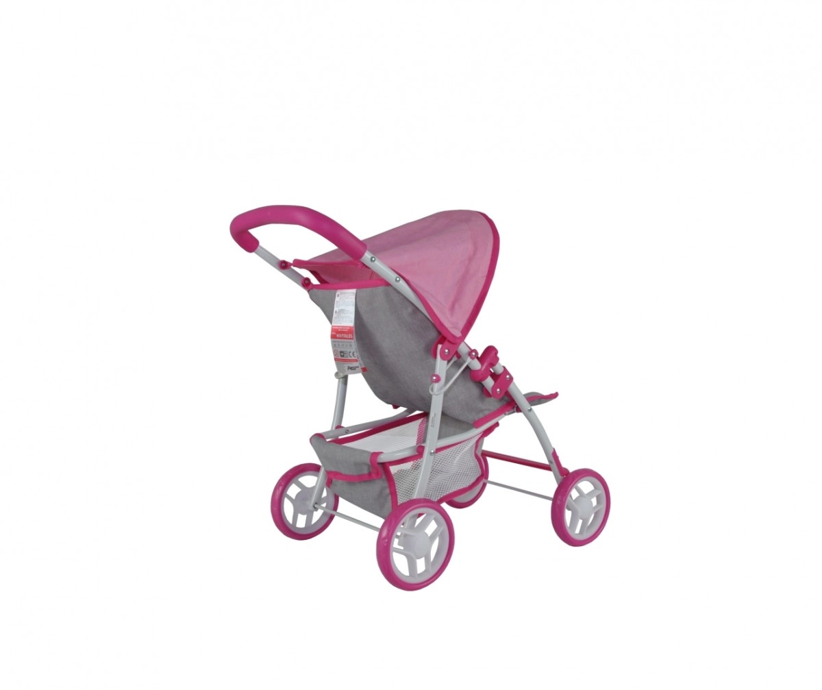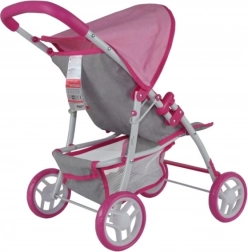 Natalie is een kinderwagen voor poppen tot een lengte van 50 cm. Hij is uitgerust met een inklapbare kap, veiligheidsgordels en zwenkende voorwielen. Daarnaast heeft hij een mandje voor poppenaccessoires die nodig zijn tijdens een wandeling, zoals flesjes melk, kleding en luiers.