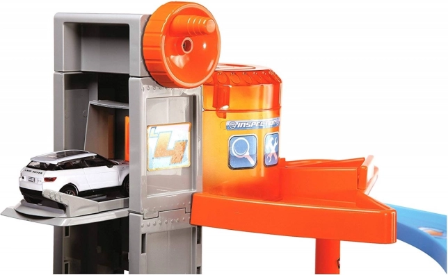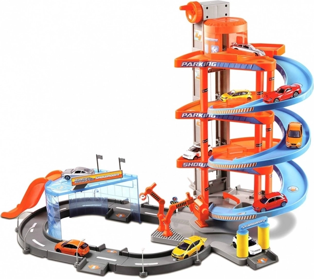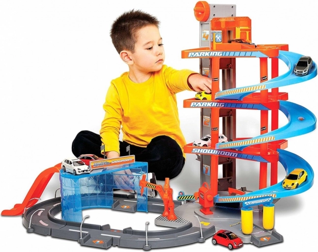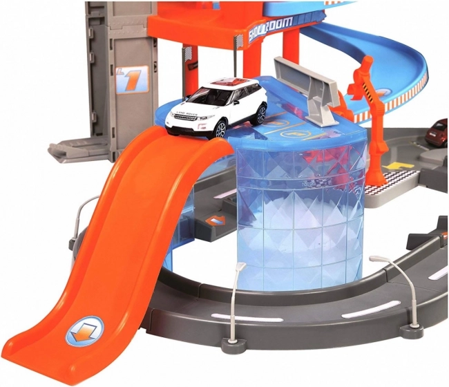 Deze meerlaagse Bburago-garage met wasstraat zit vol met functionele elementen! Breng het autootje met de lift naar de bovenste verdieping van de garage en laat het over de weg naar beneden rijden! Stop bij de service, was de auto in de wasstraat en rijd door de slagbomen!