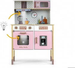 Ontdek de magie van kinderlijk koken met het houten keukentje MILLY MALLY BJORN in roze en pasteltinten. Voorzien van een oven met licht, een elektrische kookplaat met geluiden en verlichting, een spoelbak met kraan, een magnetron en een koelkast met ijsblokjesmaker. De uitgebreide set met metalen pannen en houten bestek stimuleert creatief rollenspel, fijne motoriek en zelfstandigheid. De hoogte is aan te passen dankzij verstelbare pootjes.
