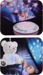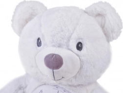 Deze zachte witte teddybeer combineert een speelgoedknuffel en nachtlampje in één. Dankzij 6 zachte slaapliedjes en 5 authentieke natuurgeluiden helpt hij je kleintje te kalmeren en een gevoel van geborgenheid te geven. De kleurrijke projector met sterren en maan creëert op muren en plafond een rustgevende sfeer die het schemerdonker verdrijft en een goede nachtrust ondersteunt.