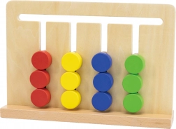 Het overzichtelijke bord met vier banen en twaalf blokjes ondersteunt systematisch sorteren, schuiven en het plannen van de juiste volgorde van stappen.