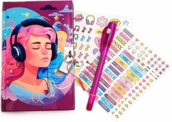 Het magisch lichtgevende muziekdagboek bevat 40 gelinieerde pagina’s. Het heeft een harde kaft versierd met LED-lichtjes en sluit met een hangslot. Inclusief 2 vellen stickers en een pen met twee punten. De ene bevat gewone inkt, de andere onzichtbare inkt die alleen zichtbaar is met het speciale “zaklampje” in de pen.