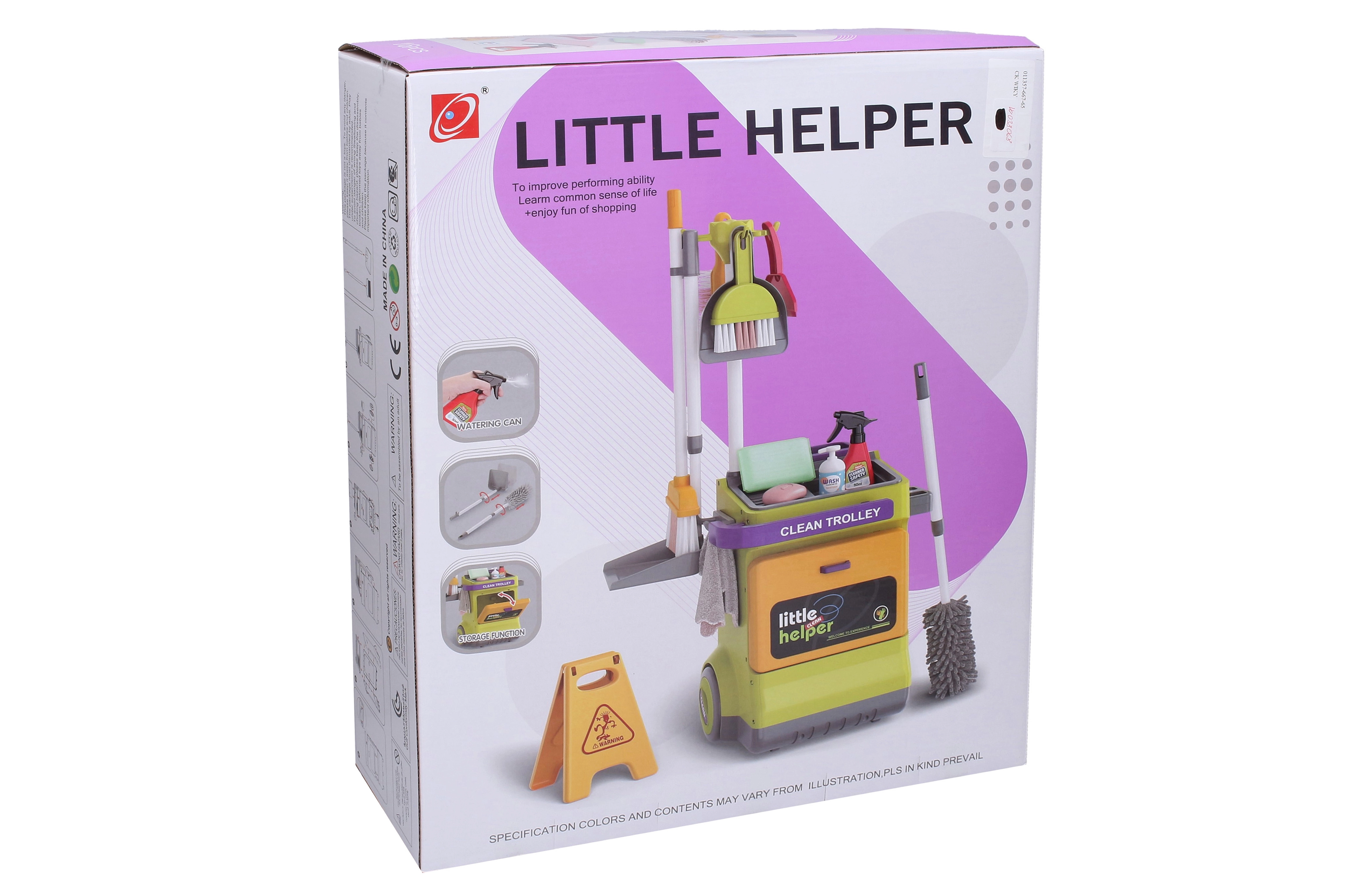Complete schoonmaakset met kar voor kleine helpers in het huishouden, met alles wat nodig is voor rollenspel rond schoonmaken. Dankzij de rijke uitrusting en realistische accessoires beleven kinderen uren speelplezier terwijl ze motoriek en verantwoordelijkheidsgevoel ontwikkelen. Inclusief bezems, handveger, stofpannen, plumeau, raamtrekker en zelfs “reinigingsmiddelen” voor een nog authentiekere ervaring.