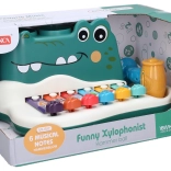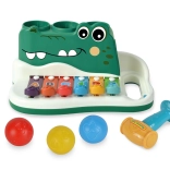 Ontdek een leuke en educatieve speelgoedset in de vorm van een krokodil-hamerspel, die ook als xylofoon dient, inclusief hamertje en drie balletjes. Afmeting 25x16x12 cm.
