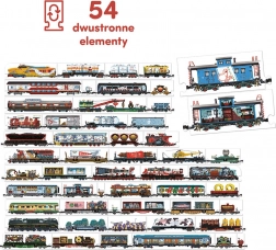Dubbelzijdige puzzel Treinen biedt plezier voor zowel kinderen als volwassenen. Verbind de stukjes op verschillende manieren en maak je eigen treinsamenstellingen. Word deel van een geweldig avontuur!