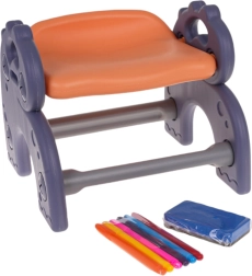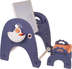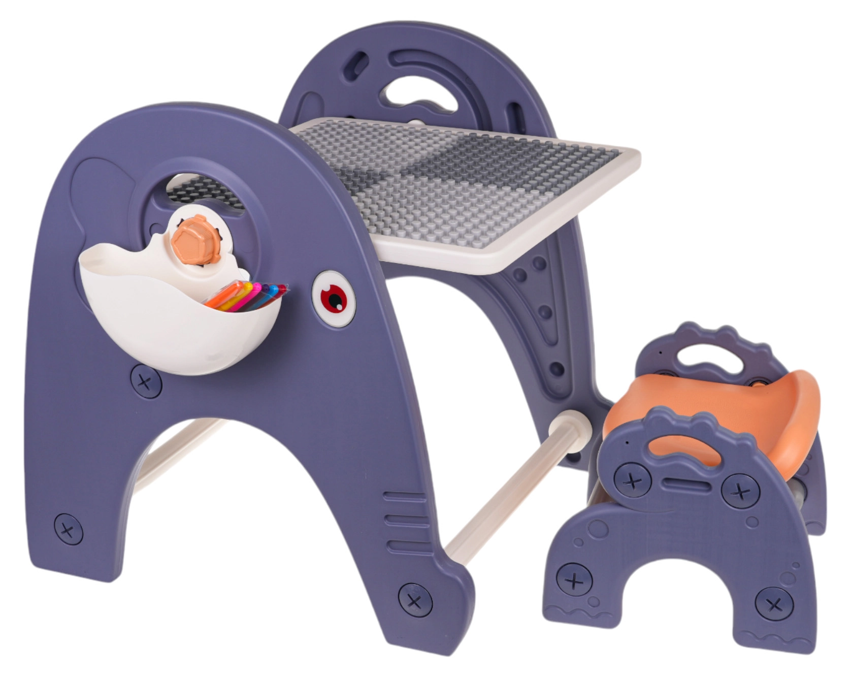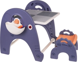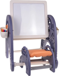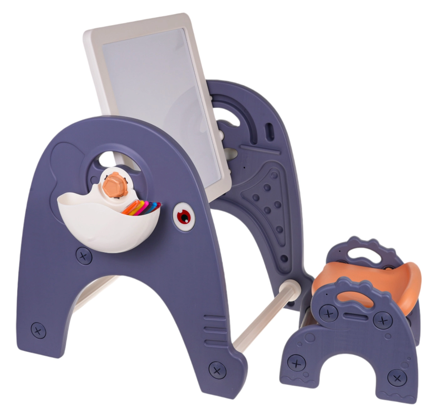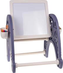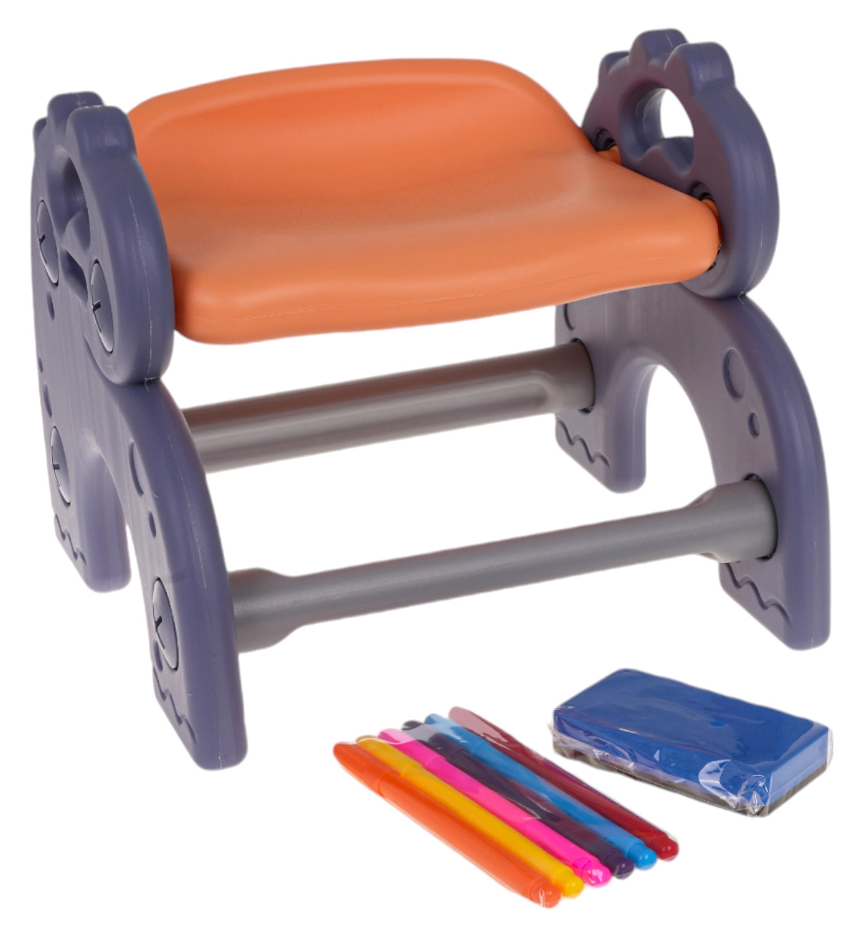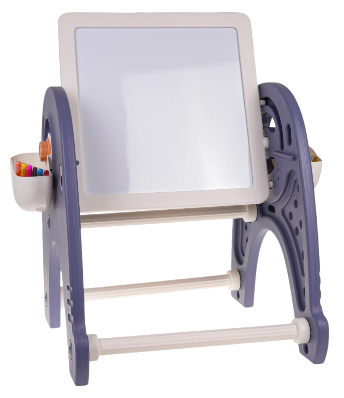 4-in-1 set: bord, tafel, bouwstenenbasis en stoel voor kinderen vanaf 3 jaar. De set is gemaakt van kunststof van de hoogste kwaliteit, heeft geen scherpe randen en is stabiel. Op de kunststof poten is een bord gemonteerd dat in elke hoek kan worden gekanteld en gedraaid. Aan de ene kant zit een tekenbord en aan de andere kant een basis voor het stapelen van blokken. Het bord en de basis kunnen verticaal of horizontaal worden gebruikt. In horizontale stand kan de set worden gebruikt als tafeltje om te tekenen, te leren of te eten, of als bouwplaat voor blokken. De set bevat een spons en 6 stiften. Aan de zijkanten van de set zitten ook twee bakjes voor schildersbenodigdheden. De set stimuleert de verbeelding en cognitieve vaardigheden van kinderen.