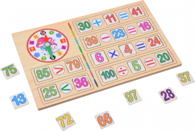 - Complete set: bord, cijfers 0–9, wiskundesymbolen (+, −, ×, ÷, =), rekenstokjes, kleurkrijt, sponsje.