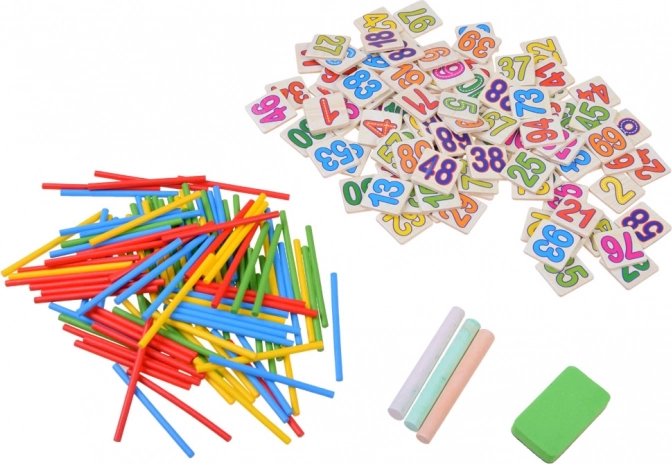 - dubbelzijdig bord, cijfers, wiskundige symbolen, rekenstokjes, kleurkrijt, sponsje