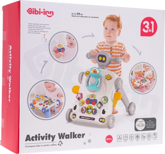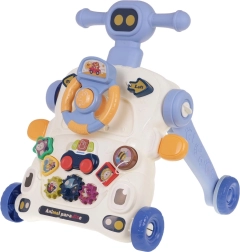 Deze multifunctionele looptrainer maakt zowel ouders als kinderen blij: hij dient als steun bij de eerste stapjes en tegelijk als activiteitentafel voor speelse ontwikkeling. Het paneel biedt een stuur met toeter, tandwielen, vormenstoof en een mini basket voor het gooien met een balletje – alles ontworpen om coördinatie, concentratie en motorische vaardigheden te versterken.