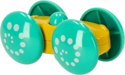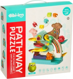 Kleurige knikkers en een klein autootje suizen over twee niveaus van banen, wat concentratie en coördinatie bevordert. Kinderen vinden het leuk om de knikkers te zien rollen en nieuwe combinaties uit te proberen.