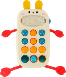 De Bibi-inn telefoon–bijter is ontworpen voor kleine ontdekkers. Kinderen worden geboeid door rubberen knoppen met een aangenaam “pop”-effect, de schuifkogel en het mini-doolhof met kralen, die hand-oogcoördinatie en geduld ondersteunen. Zachte siliconen delen (koordjes en oortjes) dienen als veilig bijtspeeltje, waardoor het kind kalmeert en tegelijk de grijpreflex oefent.