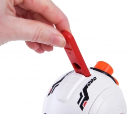 Functies van het pistool: - Mogelijkheid om team, wapentype, herladen en schieten te kiezen. - Activering via de ON/OFF-schakelaar op het handvat. - Diverse knoppen en controlelampjes, zoals een munitieniveau-indicator en een schakelaar voor team- en munitiekeuze. - Dubbel indrukken van de twee oranje knoppen activeert of deactiveert de projectiemodus. - Keuze van teammodus en wapentype via de oranje knoppen.