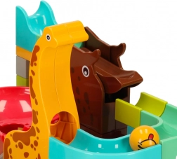 Giraf, krokodil en andere motieven zijn niet alleen decoratie – ze vormen actieve delen van de route die de rit van de knikkers nog spannender maken.