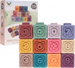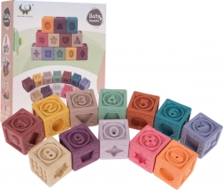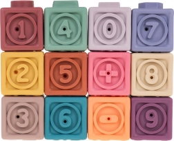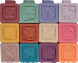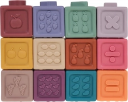 De set bevat 12 kleurrijke siliconen blokken, die visuele stimulatie en creativiteit bij kinderen aanmoedigen.