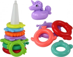 Het speelgoed is gemaakt van duurzame en veilige kunststof, is makkelijk schoon te houden en geschikt om thuis en in water mee te spelen. Dankzij de bonte ringen en het eenhoornfiguurtje stimuleert het creativiteit en verbeeldingskracht en ondersteunt het de ontwikkeling van manuele vaardigheden.
