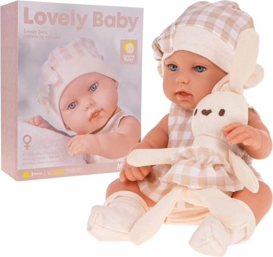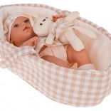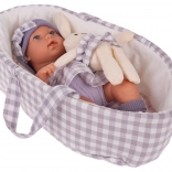 Schattige babypop met een zachte draagmand en een pluchen konijntje, leuk voor ieder kind vanaf 3 jaar. De set is hoogwaardig afgewerkt, heeft beweeglijke armen, benen en hoofd, makkelijk uit te trekken kleertjes en een textiele mand met handvatten voor comfortabel dragen. Spelen met de pop stimuleert de fijne motoriek en de fantasie.
