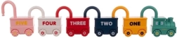 Elk voertuig draagt het cijfer 0–5 en de Engelse naam, zodat kinderen spelenderwijs leren tellen en hun eerste woordjes oppikken.