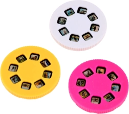 Bevat drie gekleurde plastic schijven met verschillende afbeeldingen, die eenvoudig kunnen worden verwisseld voor een gevarieerde projectie.