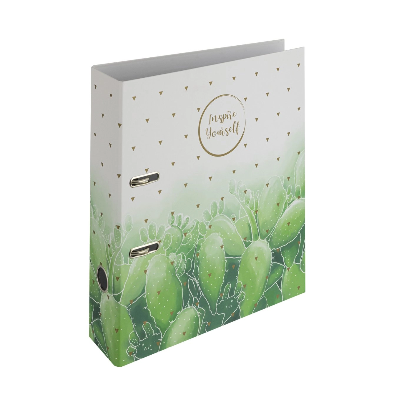 Stijlvolle hefboomordner in A4-formaat met het motief Romantic Cactus, voorzien van een rugbreedte van 7 cm, een vingergaatje voor eenvoudig uittrekken en sluitingen tegen onbedoeld openen voor veilige opslag van documenten.