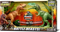 Ga op prehistorisch avontuur met Primal Clash! Dino gevecht set Carnotaurus vs Gigantosaurus. Deze set bevat twee interactieve dinosaurusfiguren met beweegbare kop en kaken en realistische geluidseffecten.
